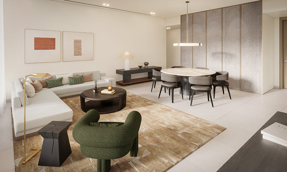 The interiors of Eden House are meticulously designed, combining refined materials and color palettes that evoke a sense of elegance and sophistication. Every detail, from the textures to the hues, is chosen to create a harmonious and balanced living environment. Expansive windows serve as gateways to breathtaking views of the Arabian Gulf, ensuring that residents remain constantly connected to the beauty of their surroundings. Eden House offers more than just a home—it provides a curated living experience where luxury and nature coexist seamlessly.
