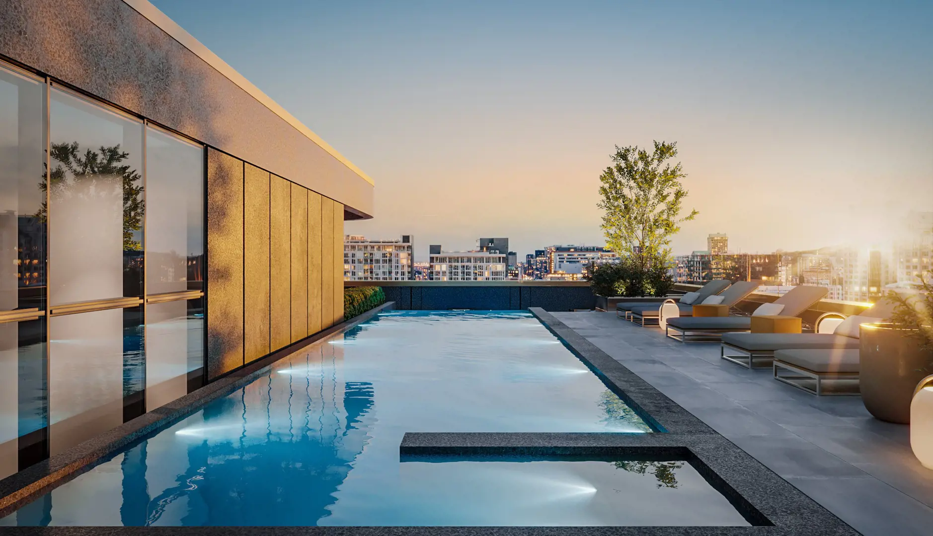 This 19-storey project, developed in the most central location of the Montreal metropolis, features 226 units of excellence designed to European standards in the selection of materials, furnishings and amenities. Blending whimsy and perfection, lightness and craftsmanship, the project includes the essential features that can be expected from Brivia Group’s luxury projects: a heated ambient alley, an indoor golf simulator, a workout and yoga room, a wine bar, a luxurious spa and sauna, work spaces and conference rooms, as well as an infinity pool and an outdoor lounge.