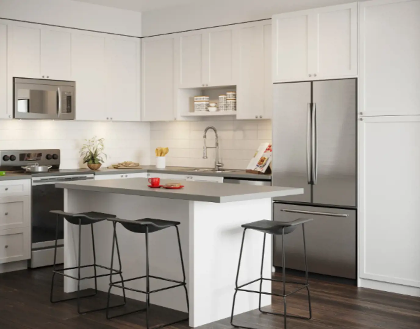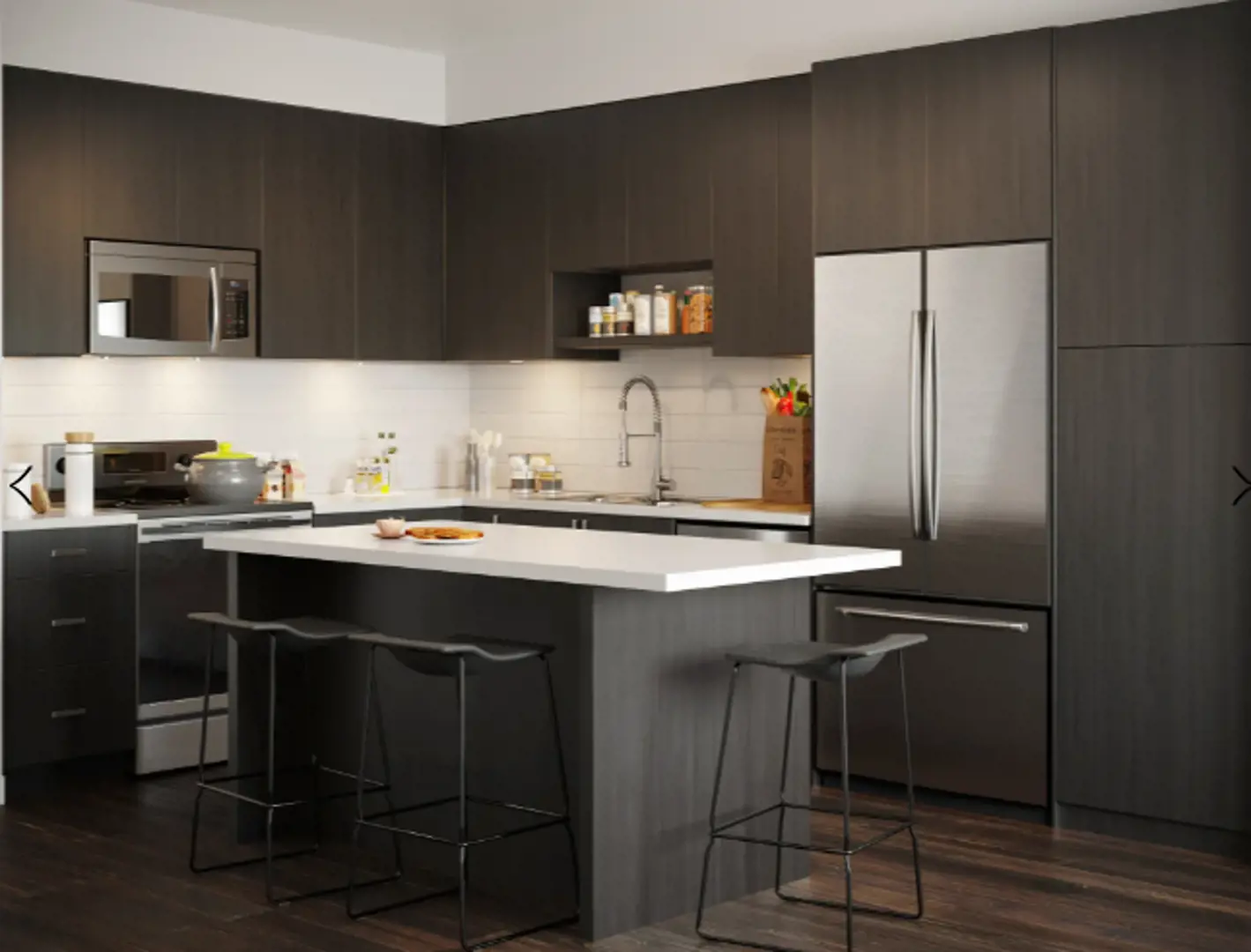 - Contemporary, dark oak flat-panel or white shaker cabinetry with designer stainless steel hardware and soft close doors + drawers