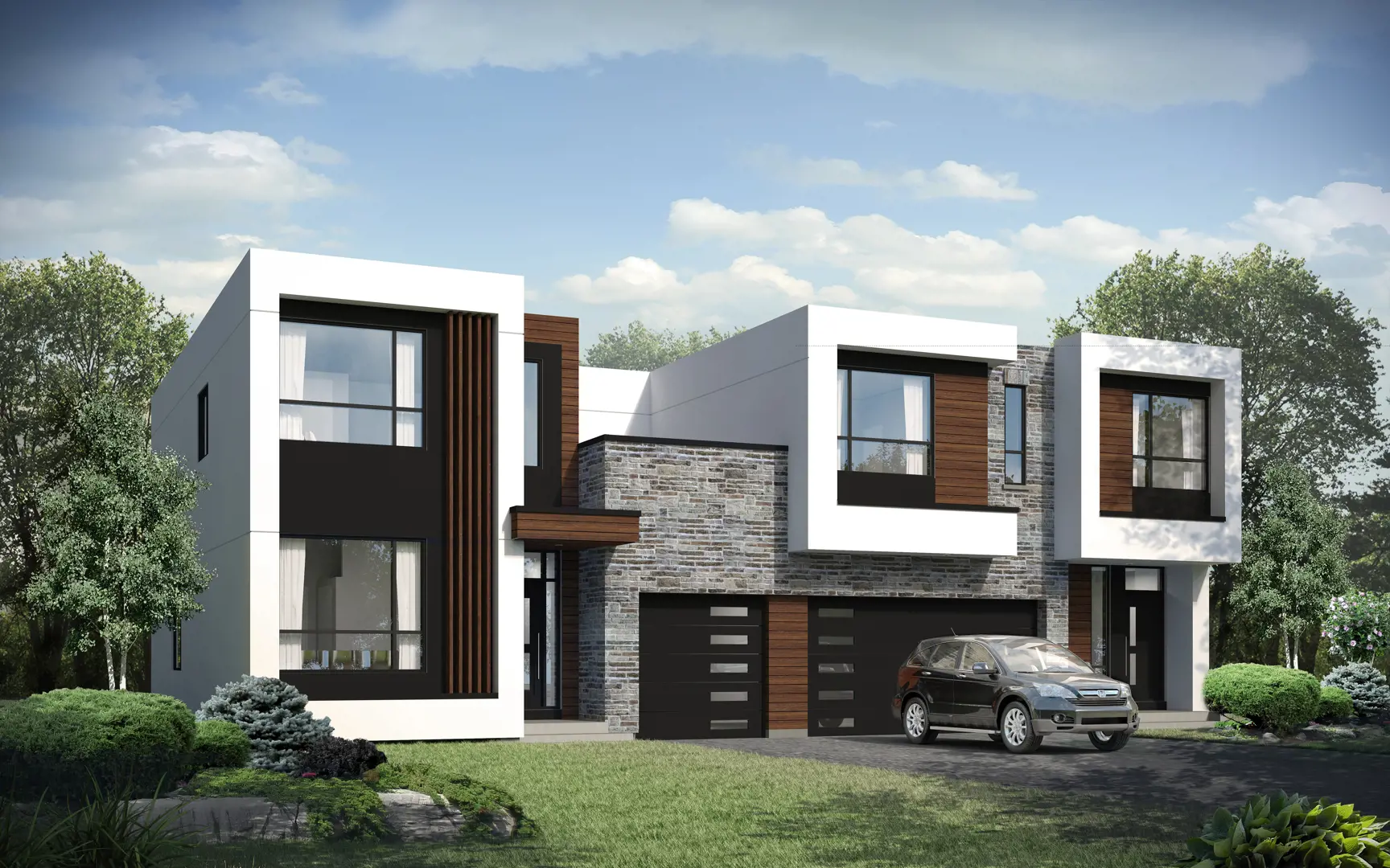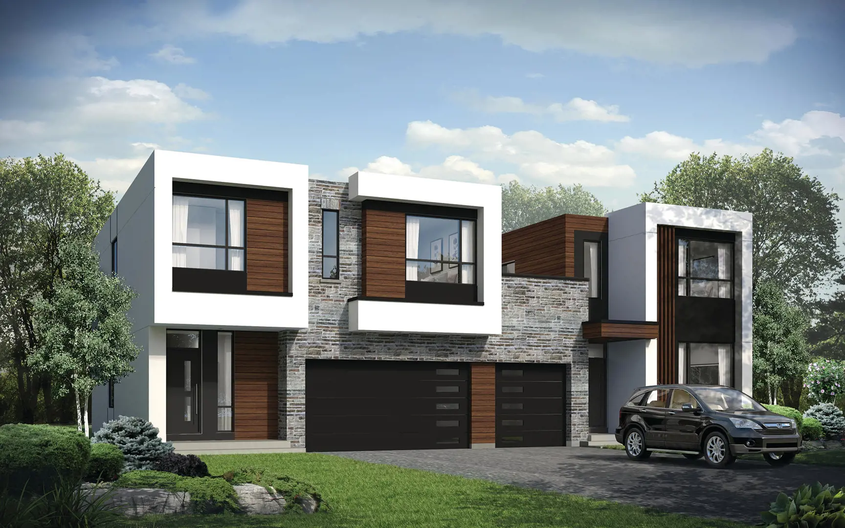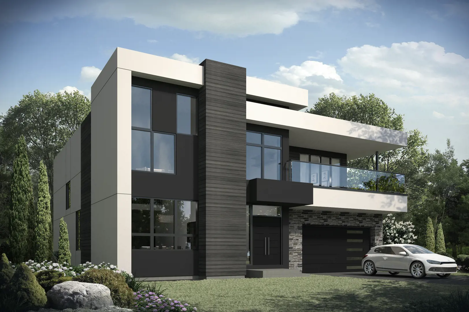 1. Distinctive modern architecture with materials such as stucco, stone, and architectural paneling with a wood grain aesthetic as per model design.