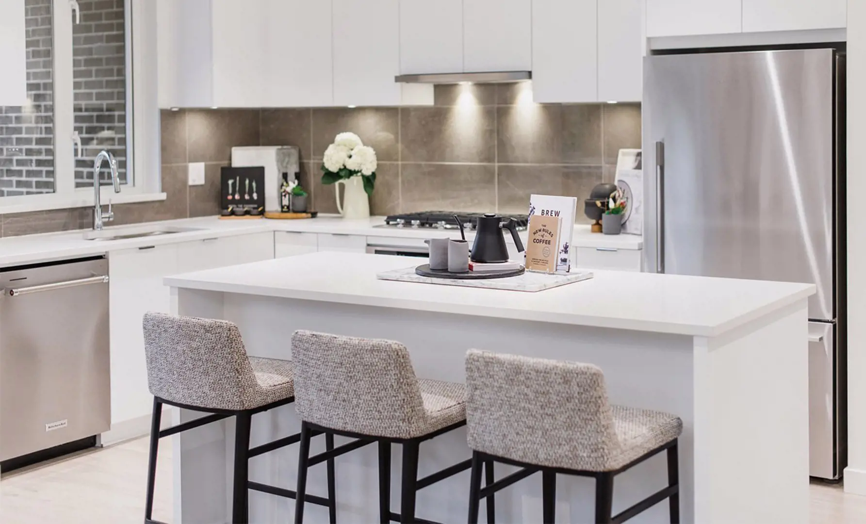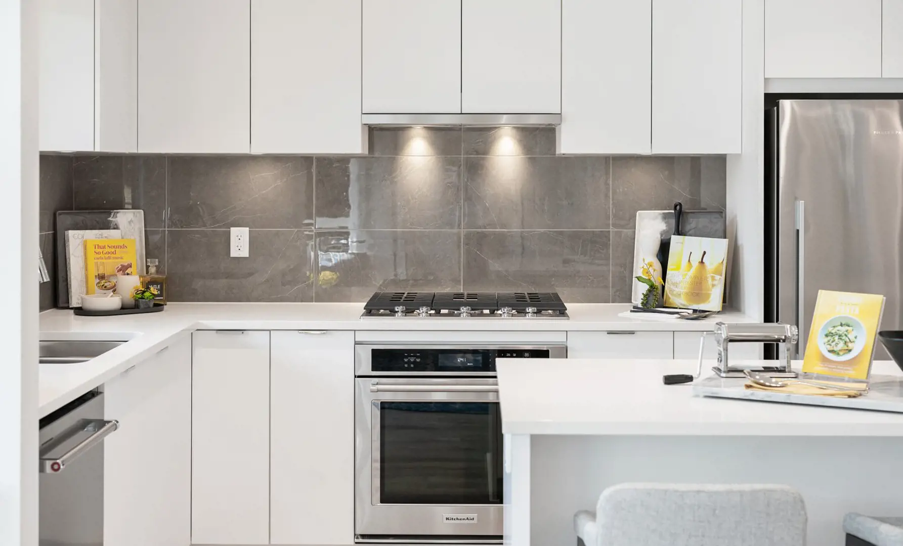 • Experience the everyday luxury of engineered stone countertops and a full-height porcelain tile backsplash