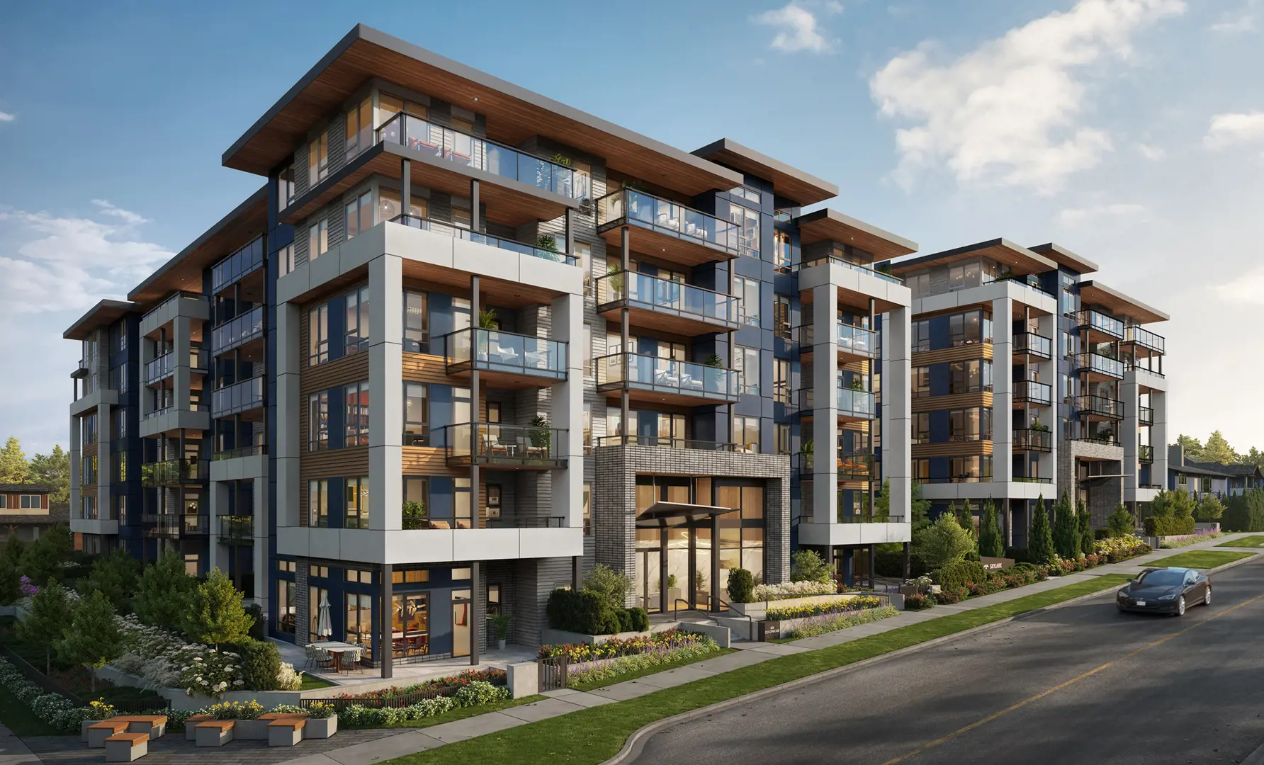 • Inspired by West Coast architecture, Skylark is comprised of two intimate buildings featuring contemporary elements, including pronounced overhangs, rich brick details and expansive windows with black frames
