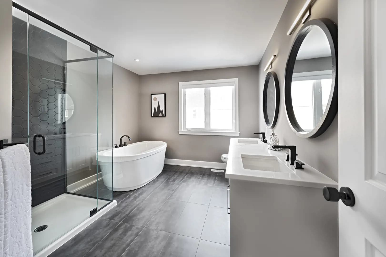 » LED pot light over all ensuite shower enclosures and main bath tubs
