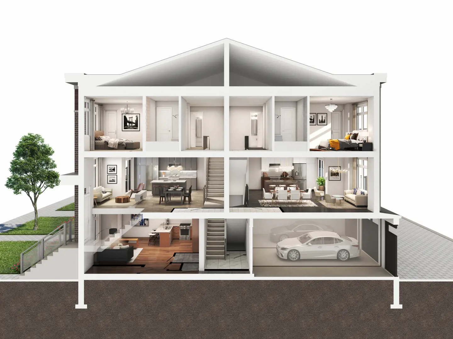 · Fully-drywalled private garage with modern garage door and direct home access.