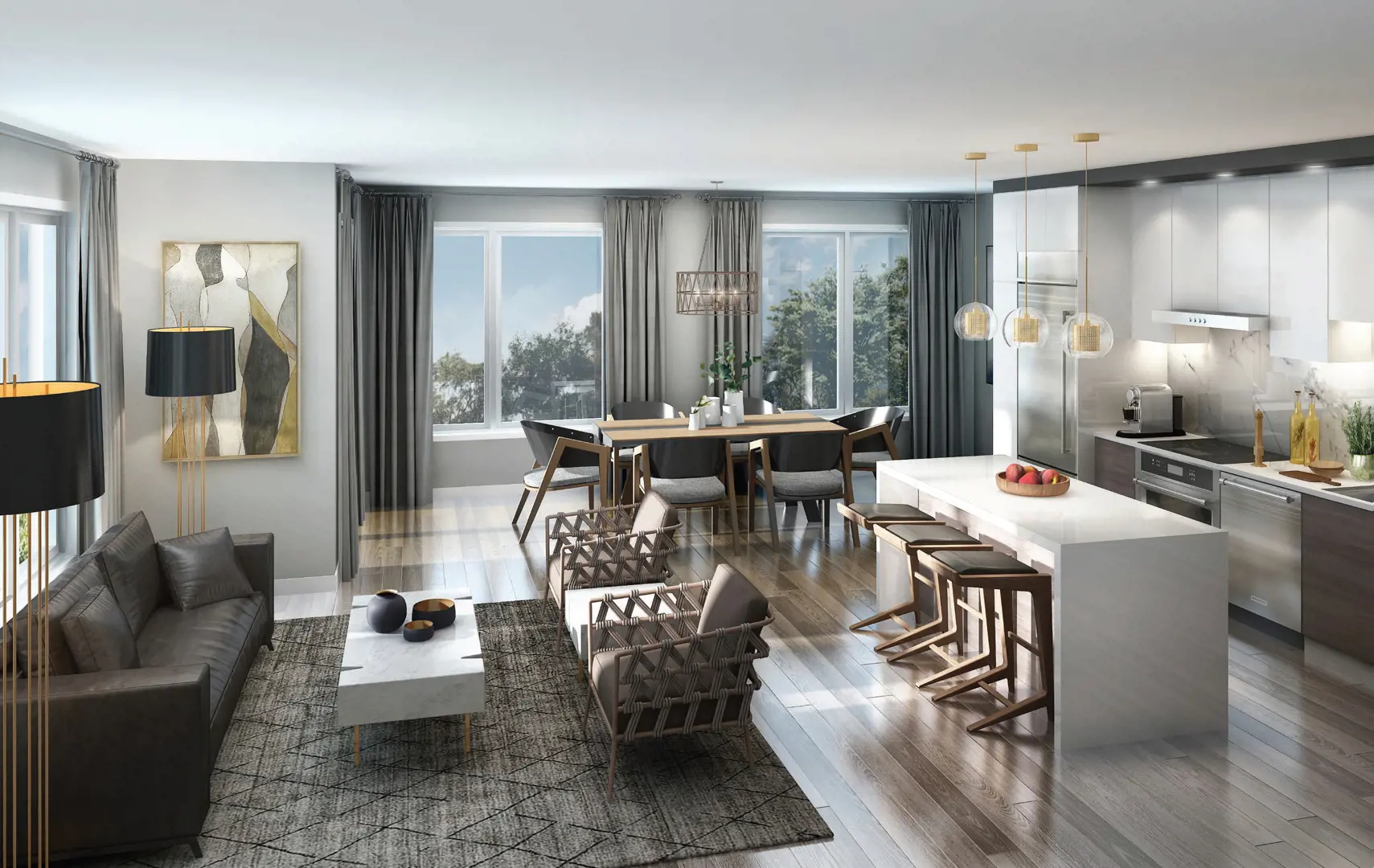 · Sleek laminate flooring throughout kitchen, living, and dining areas and adjacent hallways.