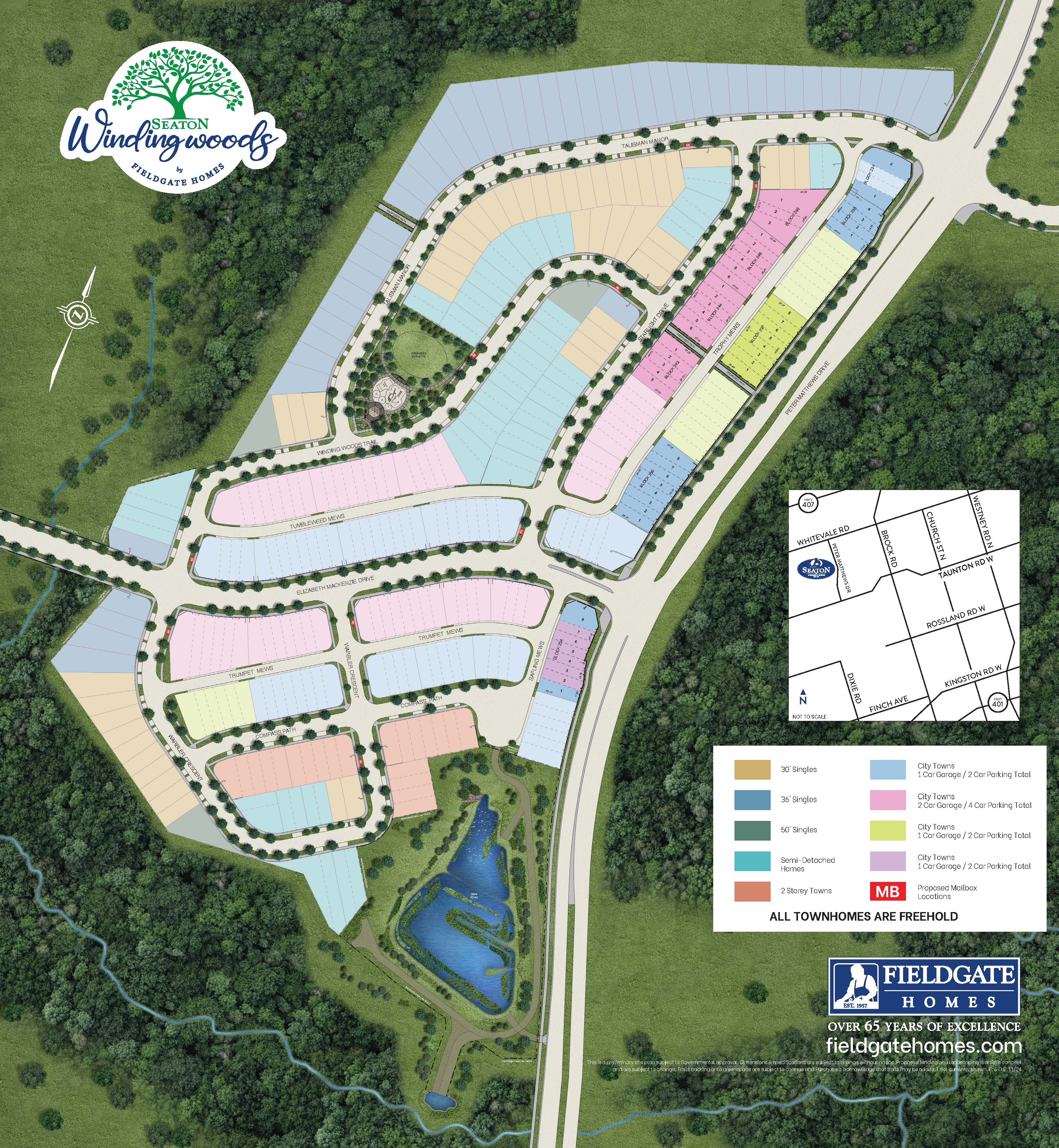 Seaton Winding Woods is a stunning new pre-construction development by Fieldgate Homes, situated at Taunton Rd and Peter Matthews Dr in the serene Seaton community of North Pickering, ON. Featuring townhomes, semis, and 30′ & 36′ single-detached homes, this development combines natural surroundings with urban convenience. It’s perfect for families and professionals seeking tranquility without sacrificing access to amenities.