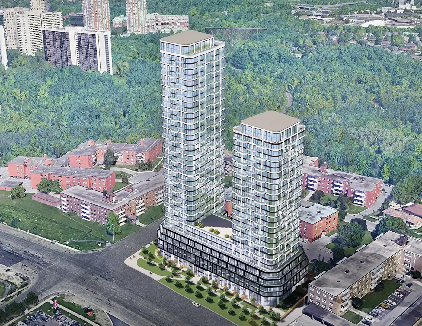 3 Swift is a planned high-rise development on Eglinton Ave E, in the Victoria Village area of North York. The development proposes two sleek and curvy towers articulated through a series of building step-backs and balconies, creating an innovative design and setting the standard for new architecture in the area. The Eglinton corridor will be enhanced with lush greenery and townhouses at grade to contribute to the public realm for residents and commuters alike. The site is located within 300 meters of the new Sloan Crosstown LRT station.