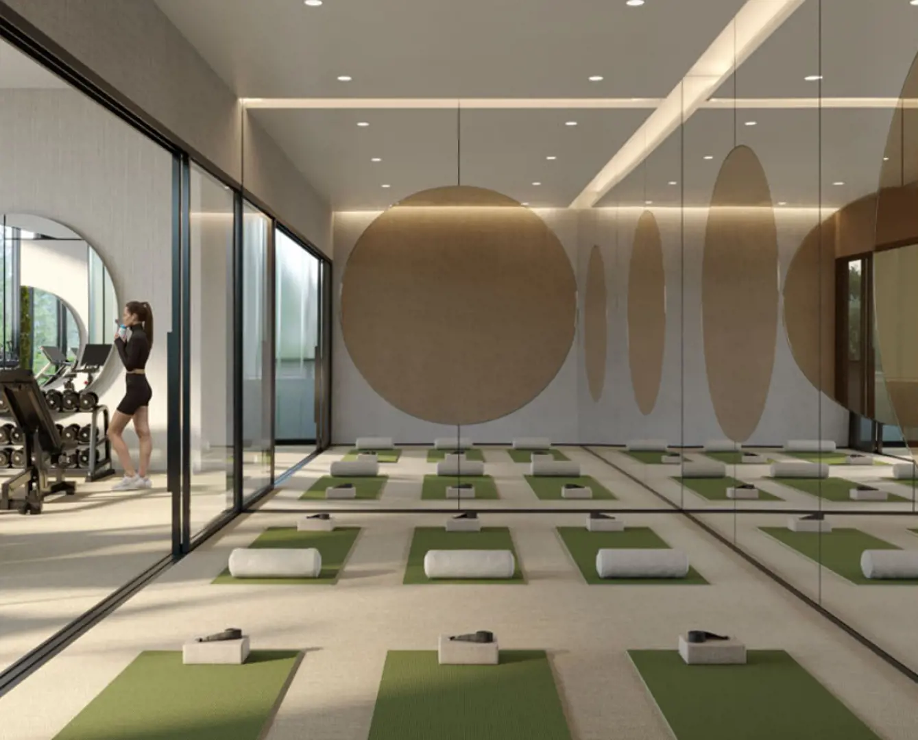 *Connected yoga, free fitness and exercise studio with TV connected to Wellbeats, or equivalent system for virtual classes