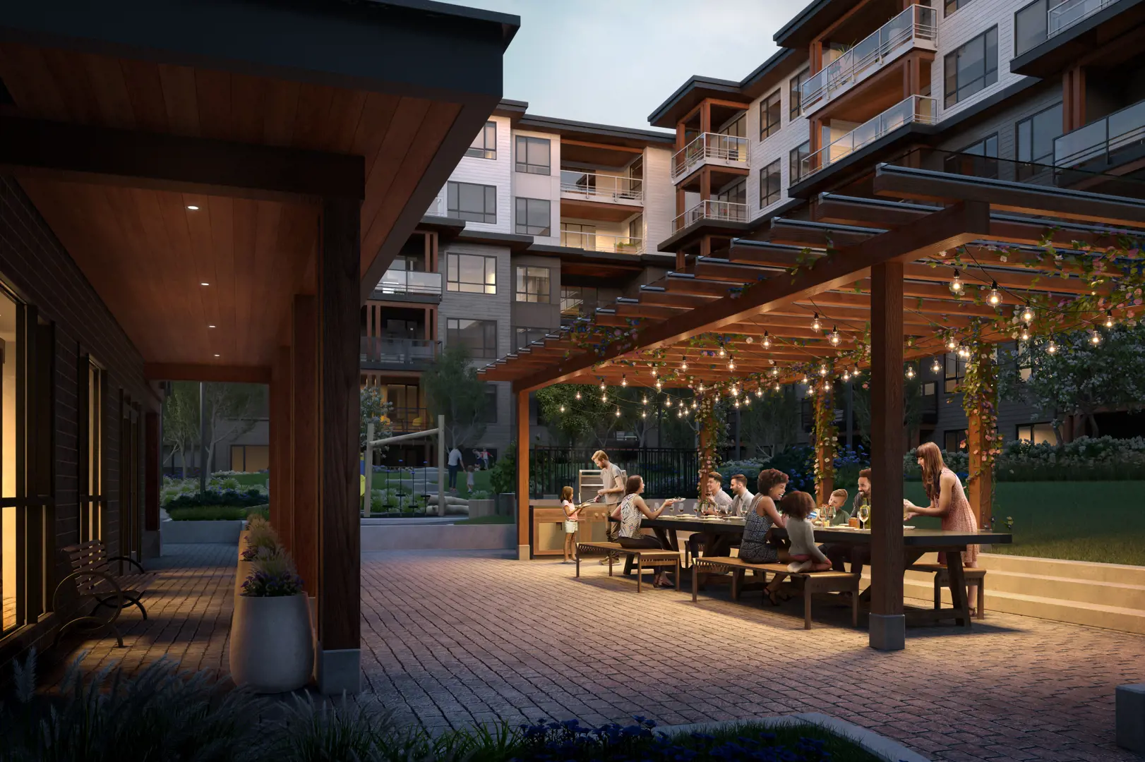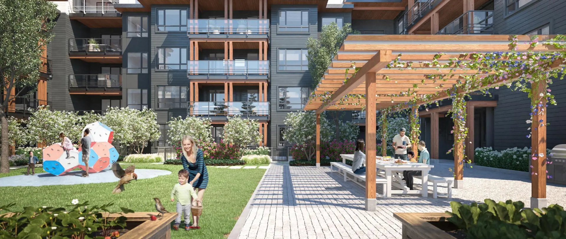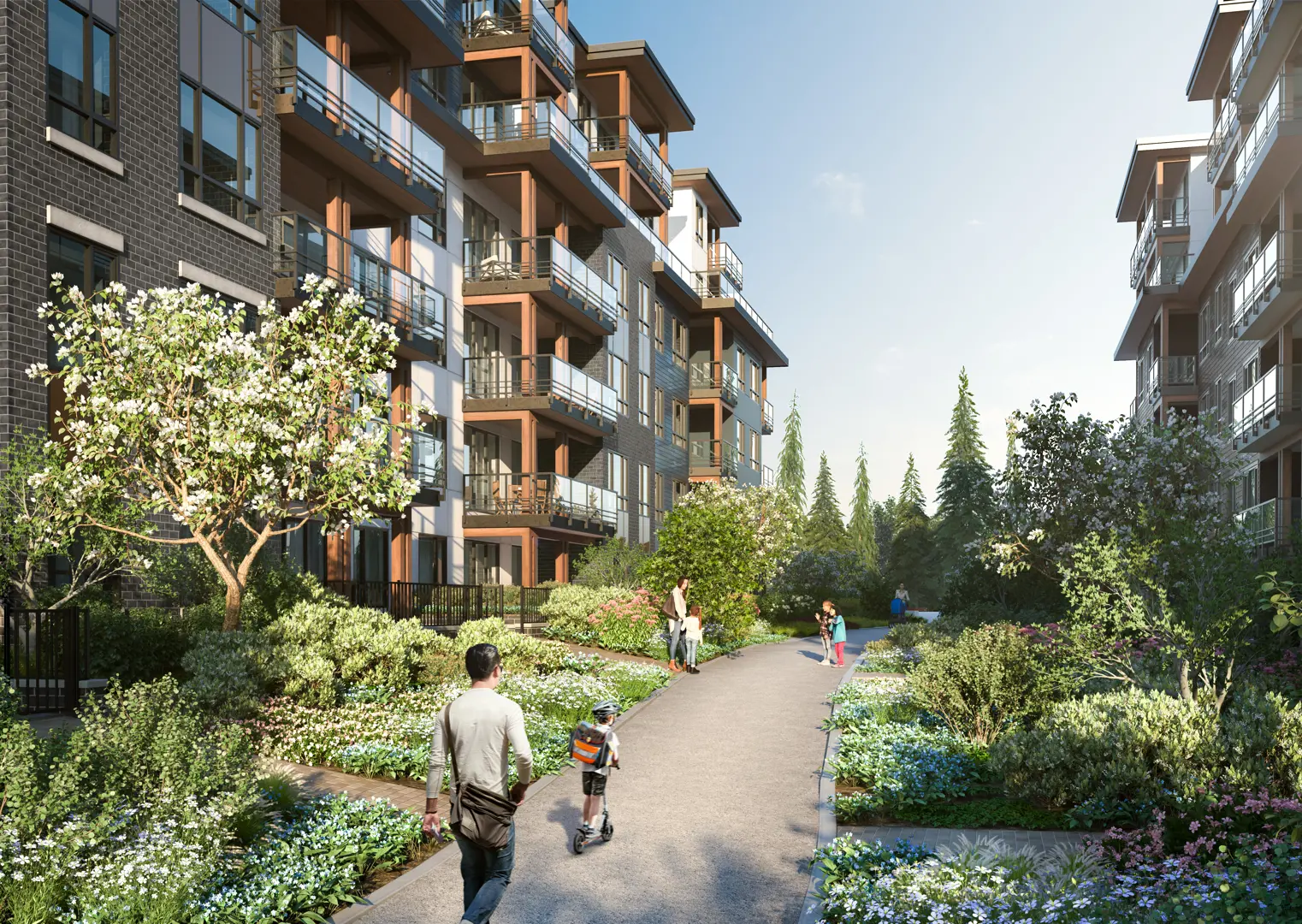 Three thoughtfully designed buildings, six storeys high, warmly welcome you home to The Oaks. Contemporary West Coast architecture that feels modern yet approachable is surrounded by lush, private greenspace. Family-friendly 1, 2 and 3 bedroom homes with high ceilings, spacious floorplans, and serene, bright interiors create an authentic sense of home within the city.