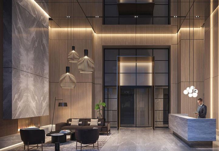 Arrive in dramatic style to a breathtaking, double height lobby featuring an extravagant fireplace, further warmed by the surrounding textured wood panel walls. Dark metal accents and sculptural lighting deliver an urban vibe, while the modern lounge seating and tables invite contemporary comfort.