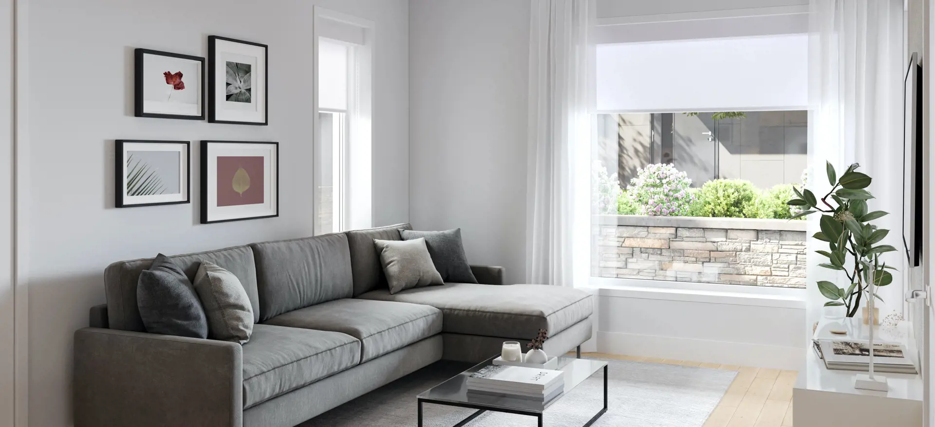 • Smooth roller shade window coverings give you privacy as well as reduces UV exposure.