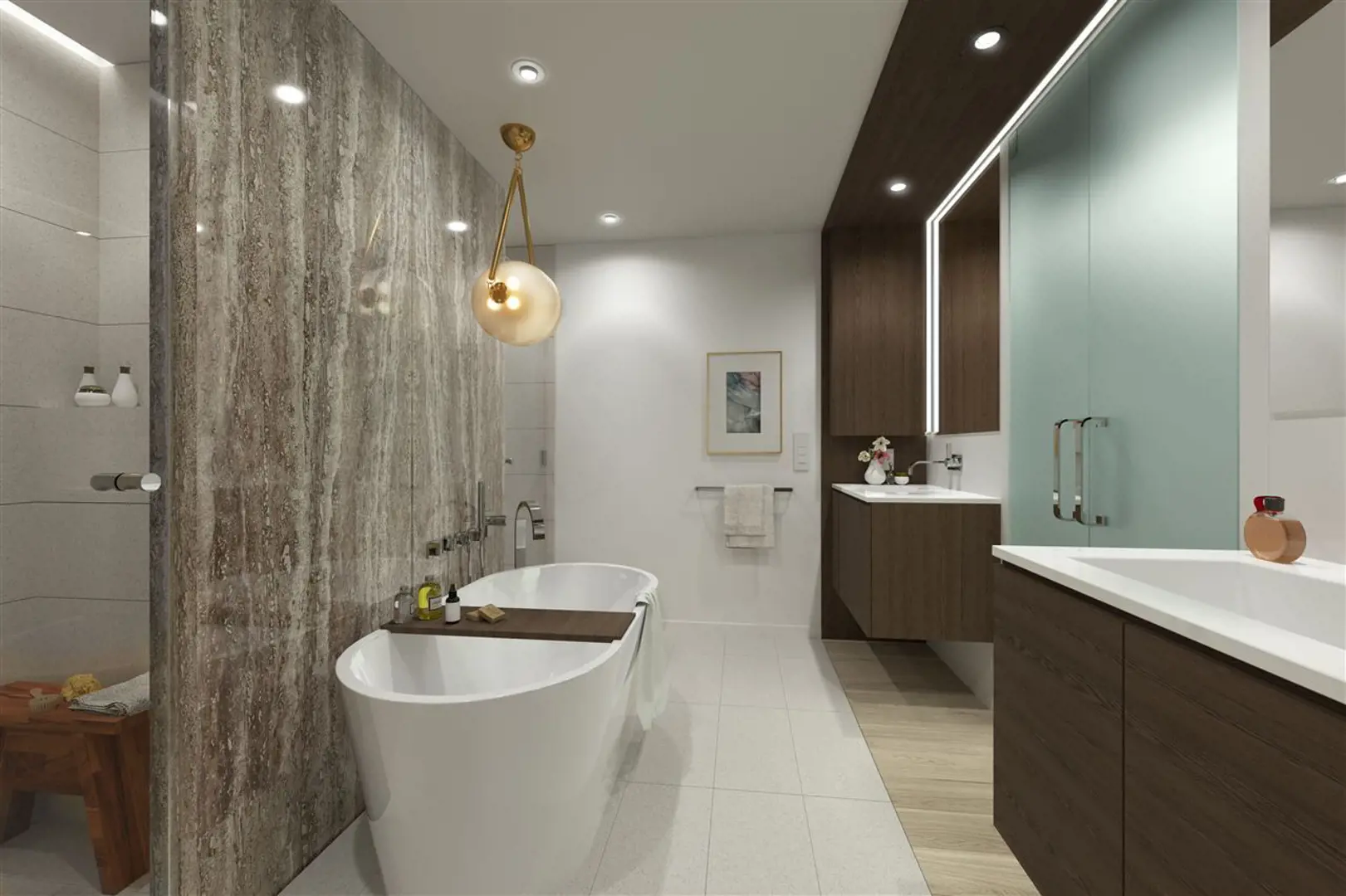• Floating vanity with LED under-lighting and halo-lit surrounds