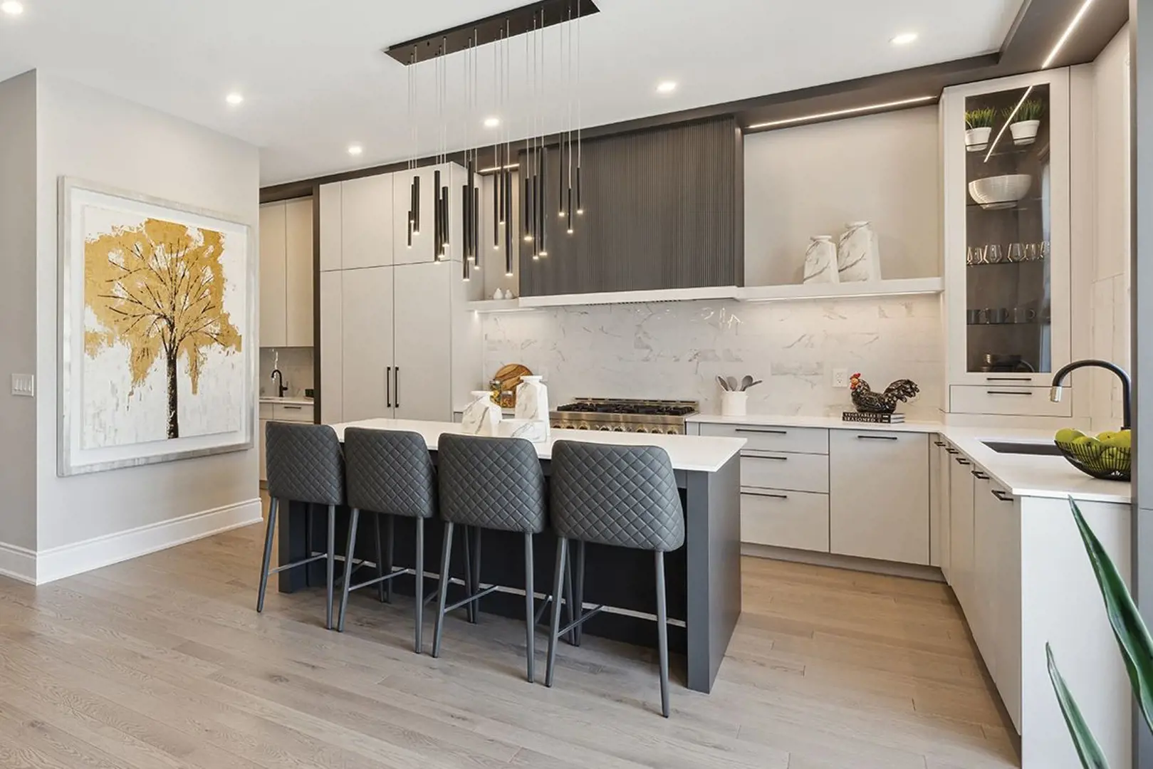 23. Quality designed cabinetry with extended height upper cabinets (from vendor’s standard selection), extra deep cabinets above fridge, matching crown molding on upper cabinets and light valance trim with valance light included. (Bulkheads may be required above kitchen cabinetry due to mechanical and or plumbing requirements).